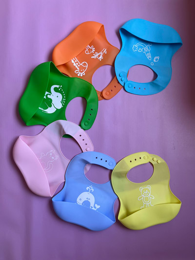 Material silicona liviana colores tiernos con animalitos y recolector de alimentos, con ganchos graduables