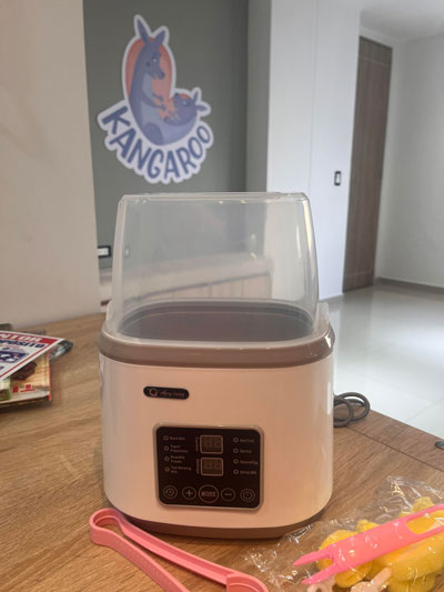Con capacidad para 6 teteros grandes de 11 onzas con base para segunda sesion donde de ubican los chupo, tetinas, roscas, rasca encias y viene con pinza de agarre.